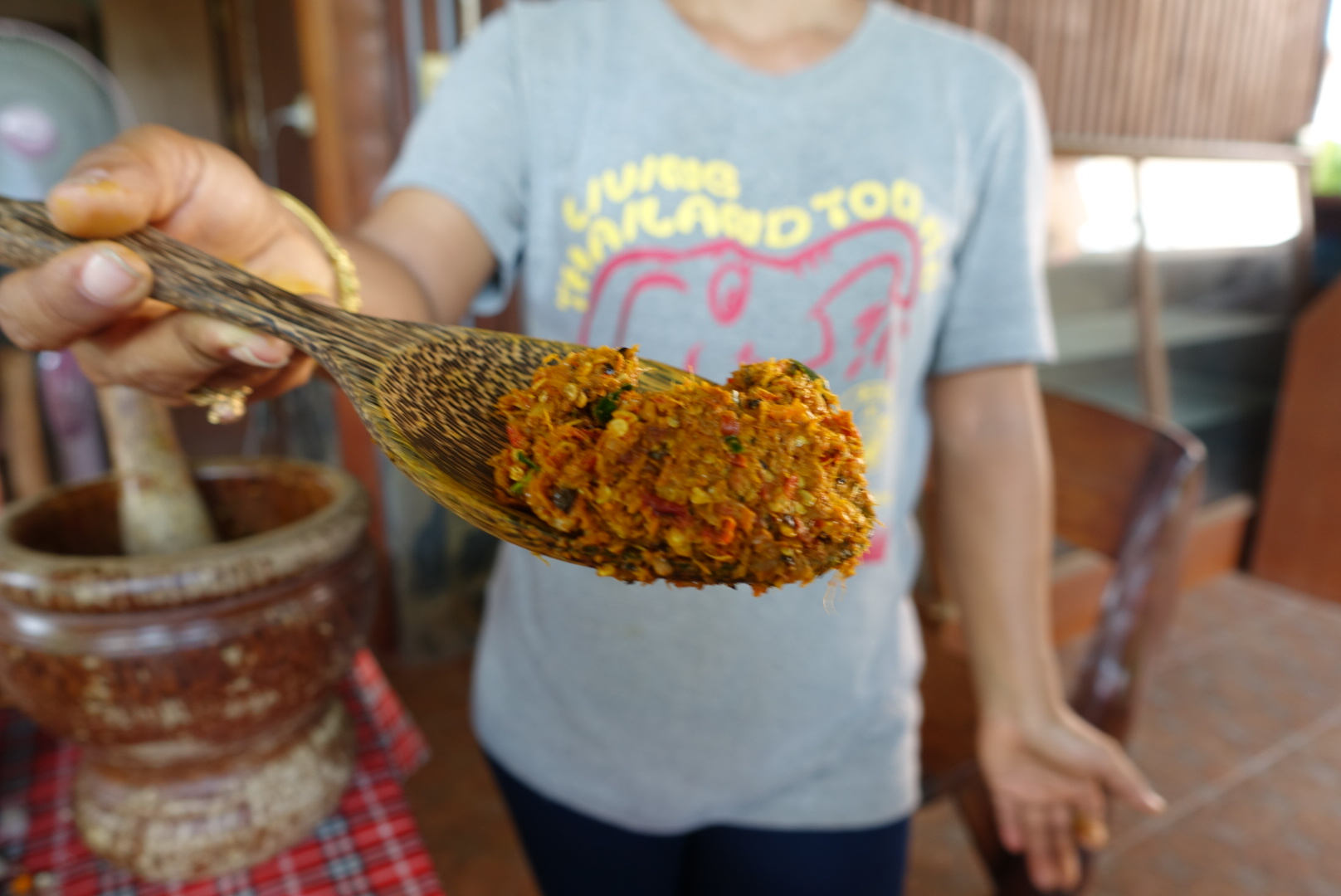 Put all ingredients into a mortar and start pounding with the pestle until you have a fine paste.